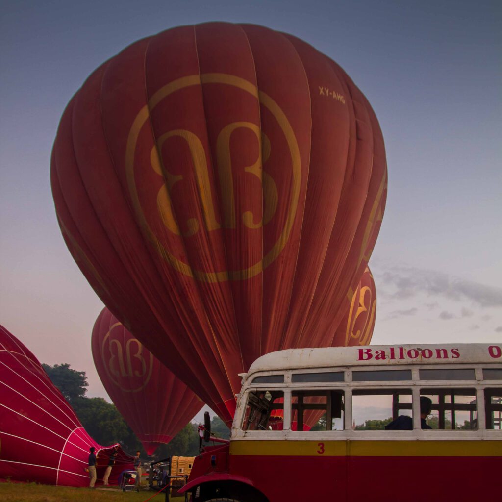 Der heutige Tag startet mit einem der Highlights dieser Reise, eine Ballonfahrt über die Pagodenfelder von Bagan. Um 05:15 Uhr werden wir abgeholt und zum Startplatz gebracht. Nach einer kurzen Einweisung durch die englischen Piloten werden die Ballons aufgeblasen. Das ist schon ein besonderes Erlebnis, wenn sich diese riesigen Luftsäcke allmählich aufrichten und den Himmel verdunkeln. Fünf Ballons mit jeweils 16 Mann an Bord erheben sich in den Himmel während am Horizont langsam die Sonne aufgeht. Man kann viel mit Film oder Foto festhalten, aber manche Dinge muss man einfach erlebt haben.