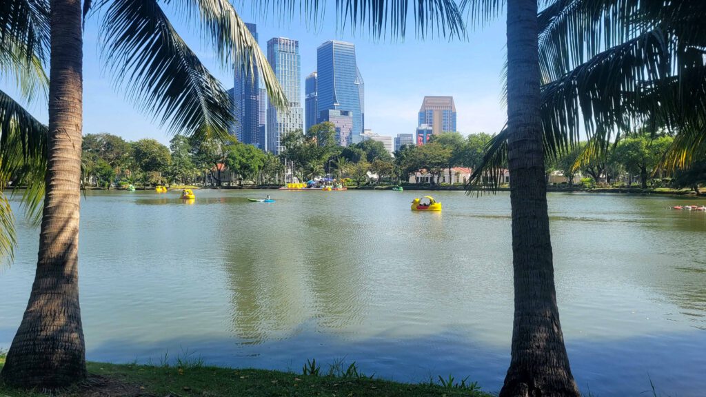 Nachdem wir hier fertig sind, geht es wieder runter ins Basement. Wir besorgen uns in einer französischen Bäckerei 2 gekühlte Kaffee mit Orangensaft und 2 Muffins to go und ab geht es in den Lumpini Park, die grüne Lunge Bangkoks.