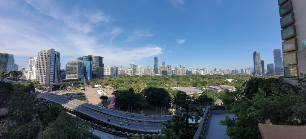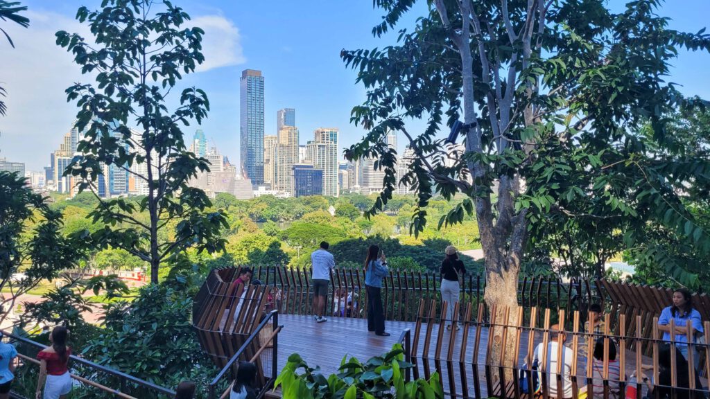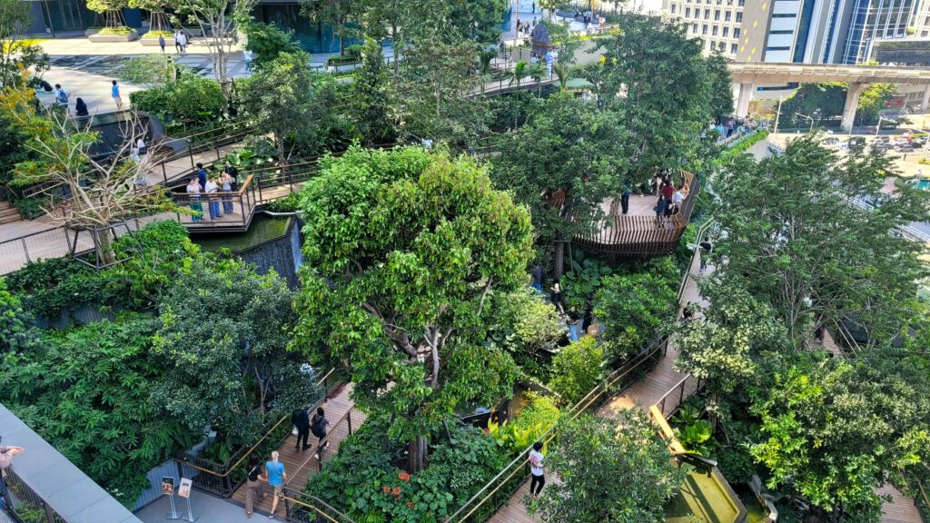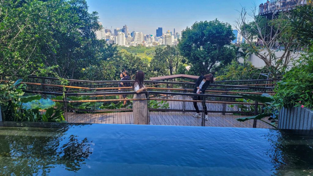 Wir starten wieder mit dem Local Boat – sie schreien immer noch – und fahren bis zum Sathorn Pier. Von da aus geht es mit dem Skytrain, ein weiteres Transportmittel zur Vermeidung der ständigen Staus auf Bangkoks Straßen, bis zum Viertel Dusit mit seinen Hochhäusern. Hier befindet sich mit dem Central Park ein weiterer Konsumtempel. Ich schau mal kurz im Flagship Store von Polo Ralph Lauren vorbei, aber sofort kleben 2 Thais die offensichtlich Umsatzdruck haben an meinen Hacken. Da der Kaschmirpulli für umgerechnet 695,– Euro in meiner Größe nicht mehr da war, ziehen wir zügig weiter. Unser eigentliches Ziel ist die 6. Etage. Dort hat vor 2 Monaten der Sky Garden eröffnet. Hier kann man auf hölzernen Wegen durch eine grüne Oase schlendern und nebenbei den Ausblick auf die Hochhäuser ringsum genießen.