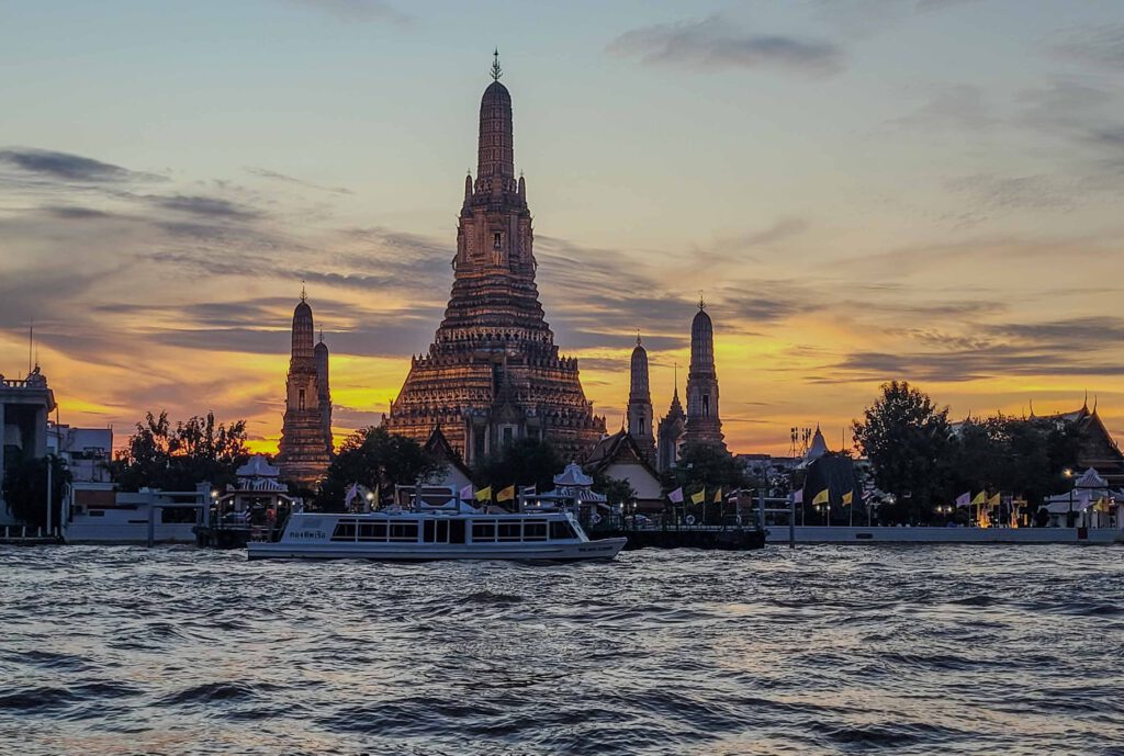 Gegen 17:00 Uhr treten wir den Heimweg an, wir haben ja gestern gelernt, dass es irgendwann eng wird. Diesmal haben wir Glück und erwischen noch ein Local Boot gegen 17:30 Uhr. Der Kahn ist proppevoll, aber wir ergattern noch 2 Sitzplätze zur Uferseite hin. 2 Stationen vor Wat Arun werden auf der gegenüberliegenden Seite 2 Plätze frei und wir wechseln blitzschnell, bevor neue Gäste zusteigen. Wir sitzen nun richtig für den Sonnenuntergang hinter dem Wat Arun. Auf den Roof Top Bars am Ufer ist das letztlich um einiges teurer. Am Wat angekommen, reduziert der Kapitän die Geschwindigkeit und bleibt direkt gegenüber dem Tempel liegen. Die Linse glüht.