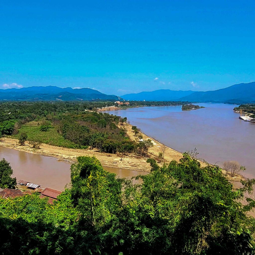 Unten am Fluss liegen Boote mit welchen die Touristen über den Mekong geschippert werden. Etwas näher an Laos heran und bis an den Punkt, wo es dann wirklich nicht mehr weiter geht, weil man sonst fremdes Gewässer befährt. Machen wir natürlich auch, bevor wir in einem nahegelegenen Restaurant direkt am Fluss unser Mittagessen einnehmen. Früher hätten wir zu diesem Zeitpunkt vermutlich zwei 36erFilme verknipst, mit den Smartphones sind wir heute eher bei Faktor 10 – also Bine. Damit das auch nach dem Mittagessen so weitergehen kann, habe ich mir ein 100W Ladegerät mit mehreren Ausgängen zugelegt, damit auch die digitalen Knipsen in Windeseile Energie bekommen. Nach gut 30 Minuten – es gibt gebratenes Hühnchen mit Thai Basilikum und Reis – sind wir gesättigt und die Handys wieder voll.