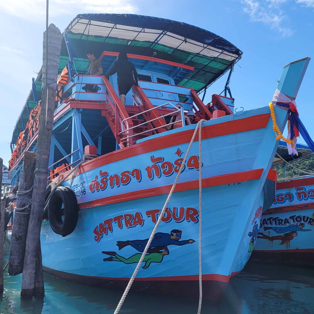 Nachdem wir die 200 Baht für den Eintritt des Nationalparks entrichtet haben, geht es über Betonstege, vorbei an Restaurants und Souvenirläden zu unserem Boot. Wir haben uns bei der Auswahl bewusst für ein Holzboot an Stelle eines Speed Boat entschieden, da es einfach gechillter und gemütlicher ist. Von daher war bereits vorher klar, dass sich die Veranstaltung nicht auf 10 Nasen beschränkt. Der Kutter hat 2 Etagen und bietet Platz für geschätzt 60 Personen. Und hier am Pier gibt es 3 Stück davon, wobei unserer der farbprächtigste ist. Wir haben die 4-Insel-Tour mit dem Sorglos-Paket gebucht und der Ablauf ist folgendermaßen: Fahrt ca. 90 Minuten
