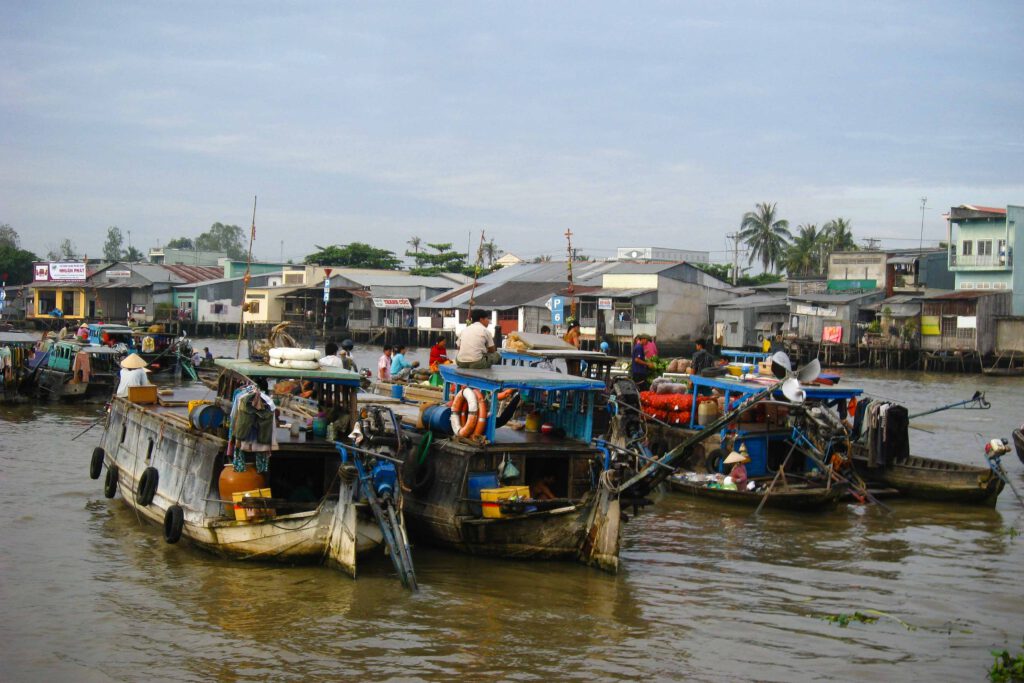 Für die nächsten 2 Tage haben wir das Mekong-Delta-Paket gebucht. Der Mekong fliesst von Tibet durch China, Laos und Kambodscha, bis er in Vietnam das offene Meer erreicht. In insgesamt 9 Arme teilt er sich auf und führt fruchtbares Schwemmland mit sich. Das Delta ist eine der Reiskammern Vietnams, bis zu 4 Reisernten pro Jahr sind hier möglich. Ein Großteil des Lebens spielt sich hier auf dem Wasser ab.