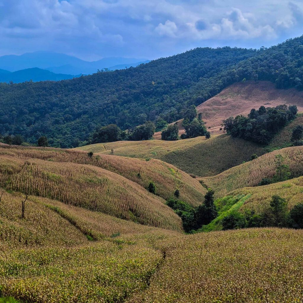 Für heute haben wir die Strecke bis nach Mae Hong Son auf dem Plan, Google sagt 4:36 für 199 km, was aufgrund der Durchschnittsgeschwindigkeit schon tief blicken lässt. Die Kurven sind im Gegensatz zu gestern etwas gemäßigter und als wir starten, scheint bereits die Sonne. Hier ist eindeutig der Weg das Ziel, wir fahren durch grüne Landschaften und kleine Örtchen und trotzdem muss man hochkonzentriert sein, da immer wieder Schlaglöcher oder herabgerutschte Steine die Straße zieren und zum schnellen Ausweichen oder bremsen zwingen. Manchmal blockieren auch Kühe die Straße.