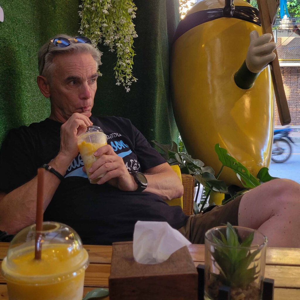 Der Laden ist total nett eingerichtet und sauber und der obligatorische Americano mit O-Saft wird hier mit frisch gepressten Orangen gemacht und ist deutlich bitterer und herber als bisher. Trotzdem lecker. Irgendwann verlassen wir die hügelige Gegend und nähern uns dem Großraum Chiang Mai. Nochmal volltanken und gegen 14:00 Uhr sind wir am Flughafen, wo wir den Wagen abgeben. Heil und ohne Macken – was am Unterboden passiert ist, kann man nicht erkennen – steht er auf dem Parkplatz. Nur die Abdrücke der Katzenpfoten vom Camping auf der Motorhaube haben wir als besonderes Souvenir mitgebracht.