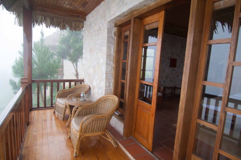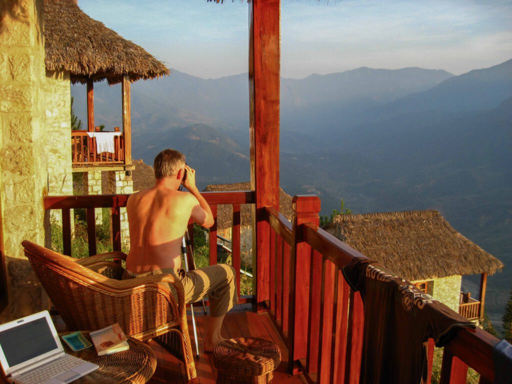 Die Eco Lodge liegt ca. 15 km von Sapa entfernt, mitten in den Bergen mit Blick auf die tieferliegenden Reisterrassen und einer himmlischen Ruhe. Nach dem Einchecken verbringen wir den Rest des Tages auf unserem Balkon hoch über dem Tal. Wider Erwarten schien die Sonne und bei ca. 30° C ließ es sich gut aushalten, fast schon etwas zu warm in der Sonne …