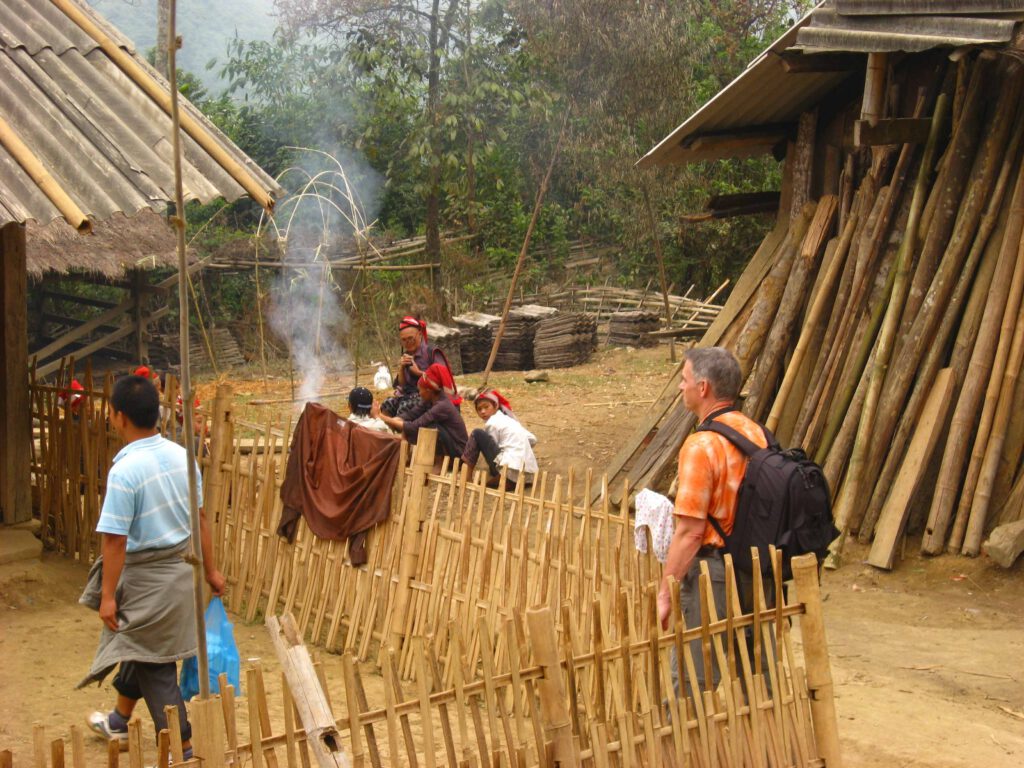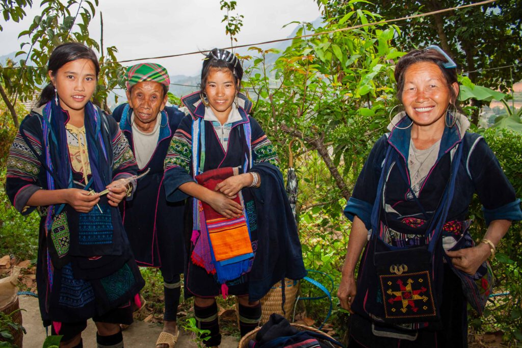 Während wir unser Getränk einnehmen, taucht plötzlich eine Gruppe von Hmong-Frauen vor uns auf, die in Körben auf dem Rücken die üblichen Mitbringsel wie Decken, Schals, Umhängetaschen mit sich tragen, um sie den Touristen zu verkaufen. Diese Damen sind renitente Vertriebler, die oft kilometerweit mit den Touristen wandern, um sie weichzukochen. Wir sind heute – vermutlich aufgrund des anfangs eher mäßigen Wetters – von dieser Tortur verschont geblieben. Wenn es dem Esel zu gut geht, ….. Also haben wir in einer halbstündigen Aktion unter zähem Feilschen einige nette Mitbringsel erstanden und die Damen waren angesichts des Geschäfts auch willens, sich fotografieren zu lassen.