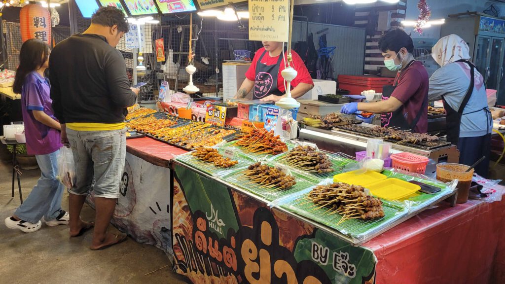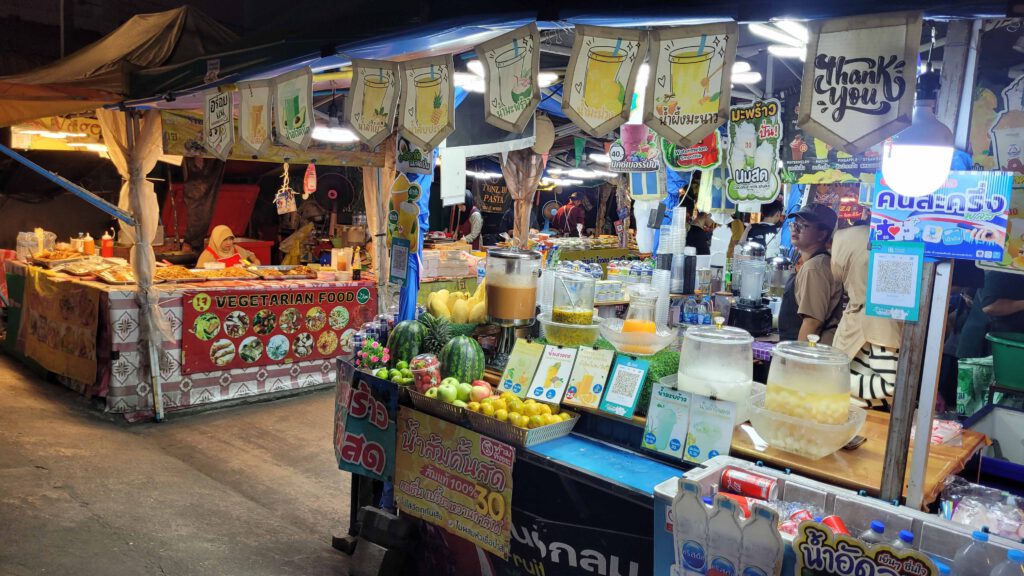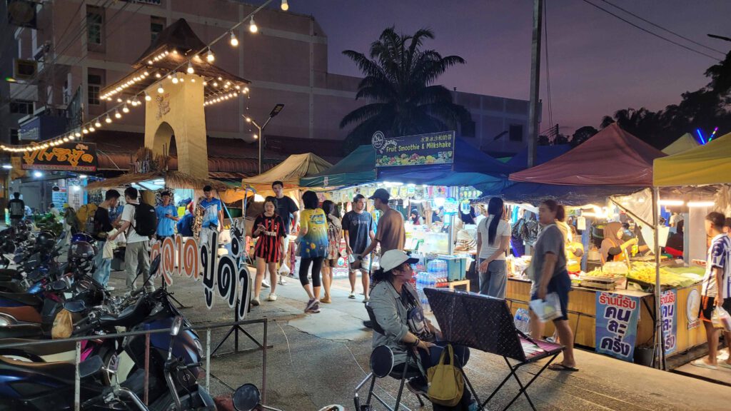 Wir haben uns für 11:00 Uhr ein Taxi bestellt, welches uns nach Krabi bringt. Von hier geht morgen der Flieger über Bangkok nach Frankfurt. Der Flug geht um 09:20 Uhr, die Fahrzeit von hier bis Krabi beträgt etwa 1 Stunde 50 Minuten, daher haben wir uns für eine Zwischenübernachtung entschieden. Unser Hotel liegt ruhig an einem kleinen Fluss, ca. 15 Minuten Fußweg bis ins Zentrum. Der Weg dorthin führt über eine Promenade am Fluss entlang bis wir zum Nachtmarkt gelangen. Eine erste Runde drehen wir direkt nach der Ankunft, weil unser Zimmer noch nicht fertig ist. Da ist hier noch nichts los, ist ja auch ein Nachtmarkt. Wir kehren daher, nachdem wir noch etwas die Stadt erkundet haben, zurück ins Hotel, machen einen kleinen Schlummi und ziehen um 18:00 Uhr nochmal los. Zwischenzeitlich hat hier jemand das Licht angeknipst und es herrscht echtes Nachtmarkt-Feeling.