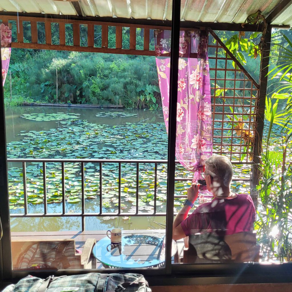Durch die Zeitverschiebung ist irgendwie der Freitag auf der Strecke geblieben. Als ich wach werde ist es bereits Samstag, die Sonne scheint durch das bodentiefe Fenster und von drinnen hat man einen herrlichen Blick über die kleine Terrasse auf den Seerosenteich. Den ersten Kaffee nehmen wir draußen auf der Terrasse, bevor es später zum Frühstück geht. Diese Unterkunft hat definitiv Charme.