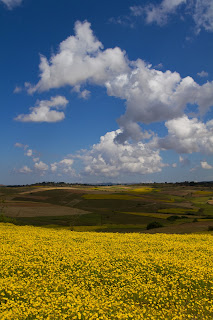 gelb, dazu die rotbraune Erde. Berge im Hintergrund. Als wir die Höhle
