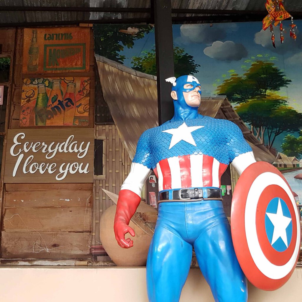 Gestern Abend war ich zum Schluss echt durch, deswegen möchte ich heute noch ein paar Sätze über unsere Unterkunft – das Ban Mai Vintage Hotel – verlieren. Der Name ist definitiv Programm, sein Besitzer, offensichtlich ein vermögender Thai hat über die Jahre eine unglaubliche Anzahl von Deko und Trödel aus aller Herren Länder zusammengetragen und sowohl aus dem Hotel, als auch dem Restaurant ein Museum geschaffen. Die Gebäude liegen an den beiden Seiten eines Flusses, verbunden durch eine Hängebrücke, die schon ein Hingucker für sich ist. Heute, ausgeschlafen und mit neuer Energie genehmigen wir uns erst einmal eine Frühstück welches für thailändische Verhältnisse richtig gut ist und anschließend eine Tour durch die verschiedenen Räumlichkeiten. Die Tour wird untermalt durch Country & Western-Musik und überhaupt hat die Sammlung einen starken amerikanischen Touch. Übt halt immer noch eine gewisse Faszination aus.